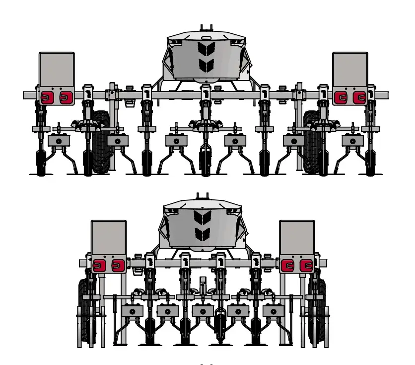 Die Maschine ist modular aufgebaut. Pro Pflanzenreihe kann ein Modul angebracht und frei konfiguriert werden. Die Arbeitsbreite kann einfach von 1,5 Metern (z. B. 4 Reihen mit 30 cm Reihenabstand) bis 3 Metern (6 Reihen oder mehr) angepasst werden. Damit eignet sich die Maschine sowohl für kleinere Flächen als auch für den großflächigen Anbau.
